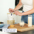 Mit einer 500 g Dose Barista Haferdrinkpulver kannst du bis zu 5 Liter Haferdrink zubereiten, welches 50 Portionen entspricht. Der kleine Beutel mit 250 g Pulver reicht für bis zu 2,5 Liter Haferdrink und der große Beutel mit 1500 g Pulver ermöglicht die Herstellung von bis zu 15 Litern Haferdrink.