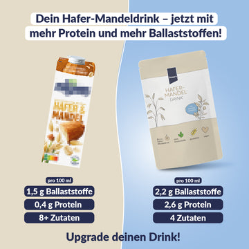 Unser Hafer-Mandeldrink Pulver enthält mehr Proteine als viele andere Hafer- oder Mandeldrinks aufgrund sorgfältig ausgewählter Zutaten und einer speziell entwickelten Rezeptur: