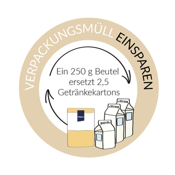 Mit einer 500 g Dose Pulver kannst du bis zu 5 Liter Haferdrink zubereiten, welches 50 Portionen entspricht. Der kleine Beutel mit 250 g Pulver reicht für bis zu 2,5 Liter Haferdrink und der große Beutel mit 1500 g Pulver ermöglicht die Herstellung von bis zu 15 Litern Haferdrink. Das spart nicht nur lästiges Schleppen und Platz, sondern zudem Verpackungsmüll.
