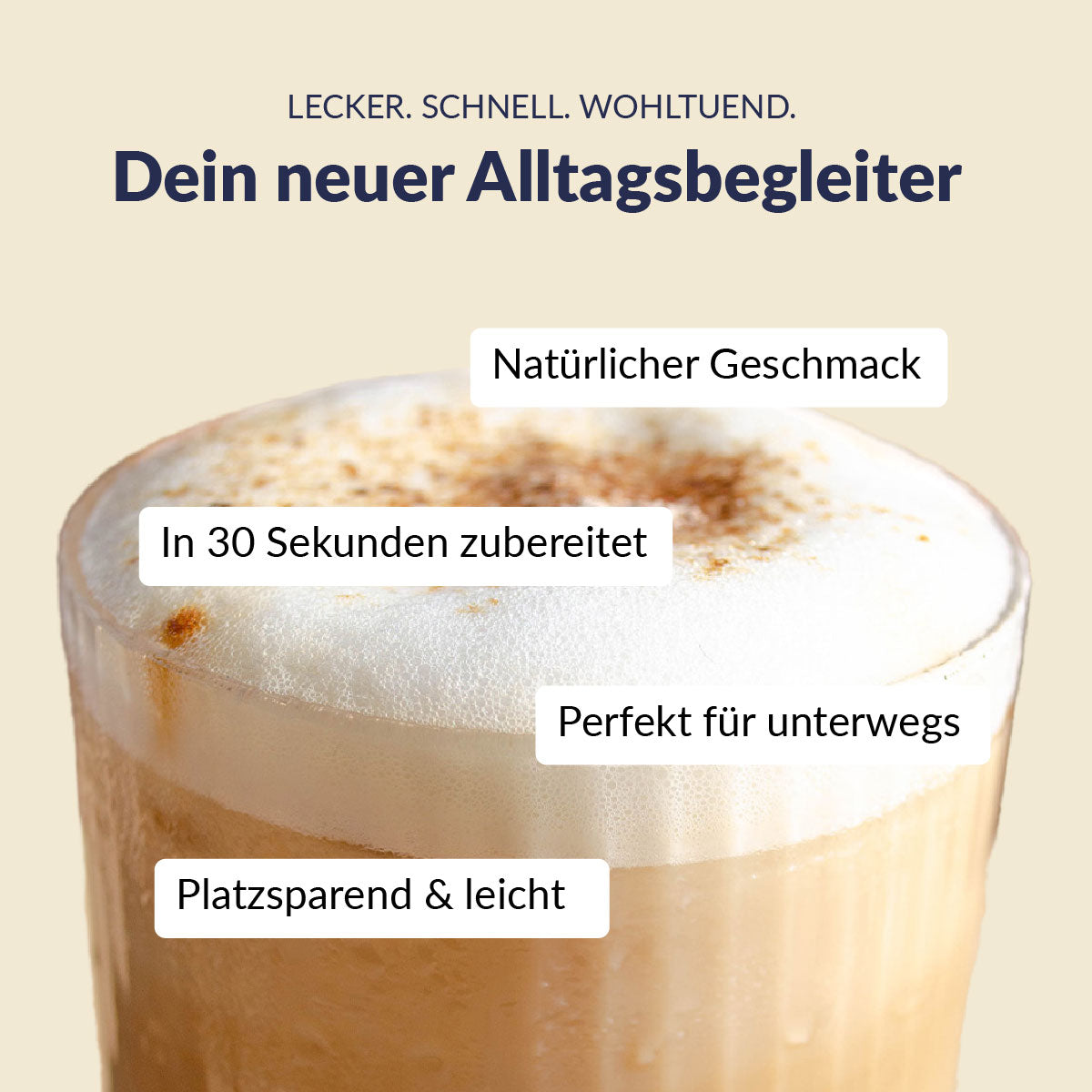 Dank der einfachen Zubereitung genießt du im Handumdrehen deinen Lieblings-Latte: Pulver in die Tasse geben, mit heißem Wasser oder warmer Milchalternative aufgießen, umrühren – und schon wartet ein cremiger Moment voller Genuss auf dich.