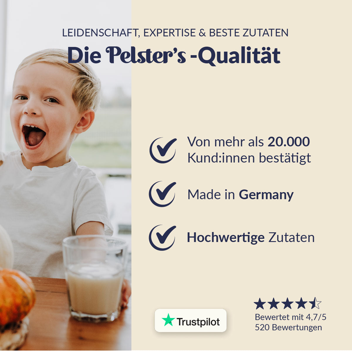 Alle Pelster's Kids Produkte tragen das Bio-Label und bestehen zu 100% aus Bio-Zutaten. Dies wird jährlich durch ein unabhängiges Prüfinstitut geprüft und zertifiziert (DE-ÖKO-006).
