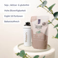 - 30g Proteinpulver mit 300 ml kaltem Wasser und 15-30g Bio Haferdrinkpulver mischen.