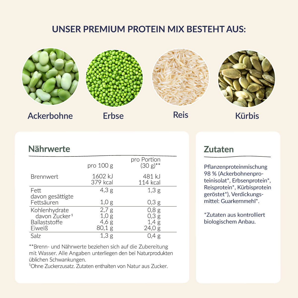 Unser veganen Proteinpulver bestehen aus einem hochwertigen 4-Komponenten-Mix aus Ackerbohnen-, Erbsen-, Kürbis- und Reisprotein – natürlich bio-zertifiziert und frei von künstlichen Aromen, Süßungsmitteln und zugesetztem Industriezucker.